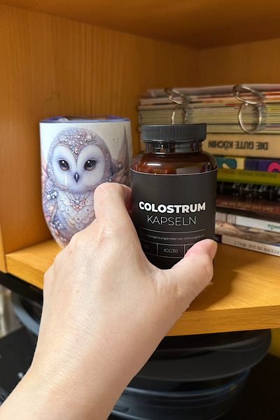 Morgens der erste Griff ist immer zu meinem Colostrum. Noch im Halbschlaf und vor allem anderen – ich versuche, damit mein Immunsystem zu stärken.