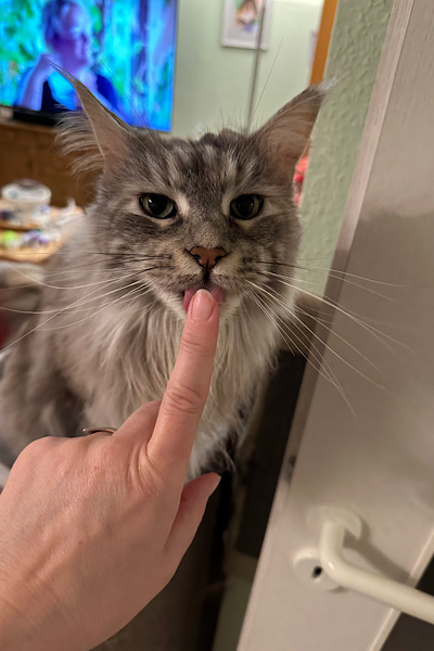 Was hat der Bursche sich früher gegen Bürsten und Kämme gewehrt…Ich sah oft echt lecker aus. Heute genießt der Große das Bürsten nach der Inhalation. Es gehört zum täglichen Ritual. Anschließend werden noch die Ohren schön sauber gemacht und die Augenkrümel entfernt. Wenn er hübsch und entspannt ist, geht’s in die Küche zum Nachmittagsdinner. Öhm, ich könnte die Winterdeko auch mal wegräumen…