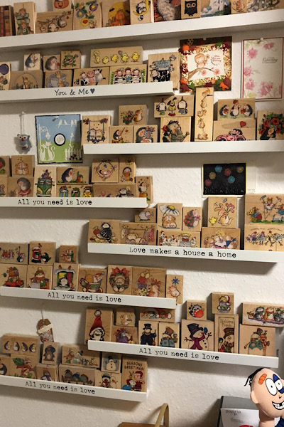 Mein Bedarf an besonderen Stoffen, schöner Wolle, Sammeln von Porzellanbärchen (Cherished Teddys), Teddy-Sammeltellern, Eulen und Teddys in jeglichen Ausführungen, Büchern und Zeitschriften war schon groß. Später, so Ü30, spezialisierte ich mein Sammeln auf ausgewählte Dinge, und dann begann meine Leidenschaft fürs Kartenbasteln. Das war der Startschuss für meine umfangreiche Sammlung von vielen tollen Holz- und Gummistempeln, hauptsächlich mit niedlichen Motiven – so wie meine heißgeliebten Penny Blacks. Da schaltete in meinem Hirn echt das „Haben wollen“ alles andere aus. Das galt auch für andere Marken und Stempelfarben und Stanzen und und…